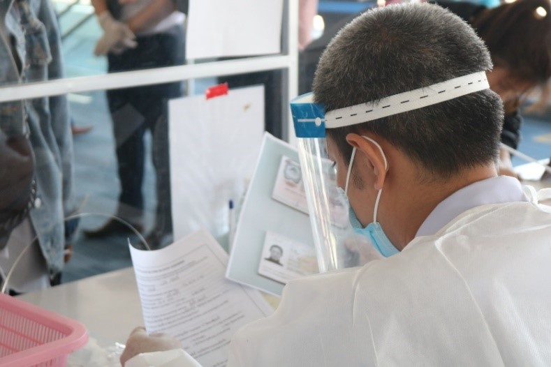The health staff checked the completeness of documents from the passengers, including COVID-19 test results taken before departure and the health declaration form. Photo credit: WHO/Irene Tan