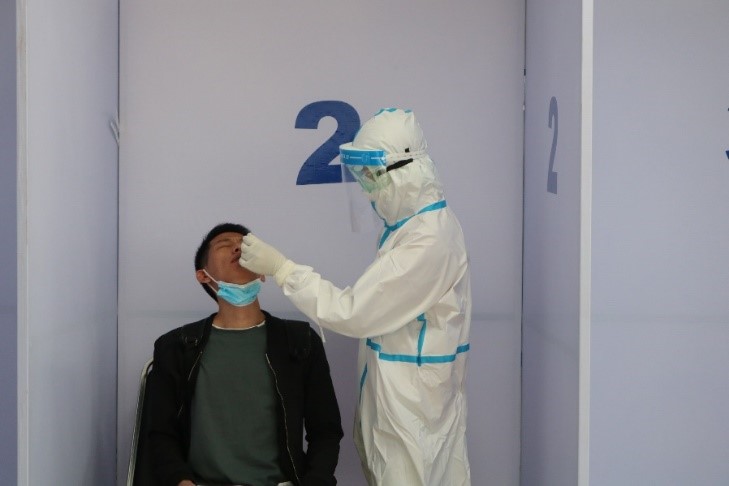 Health staff wait at the COVID-19 sample collection area Photo credit: WHO/Irene Tan